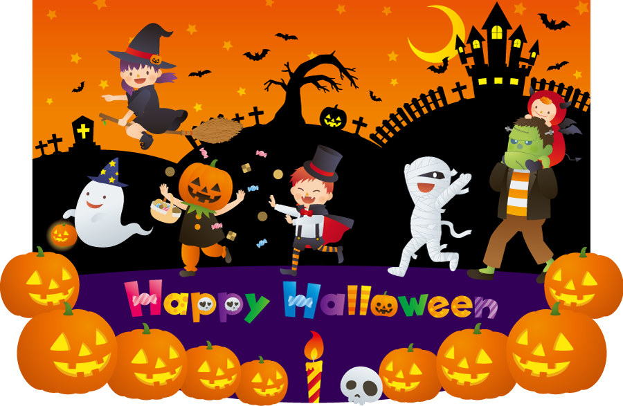 [フリーイラスト] 魔女と妖怪たちが集まるハロウィンの背景でアハ体験