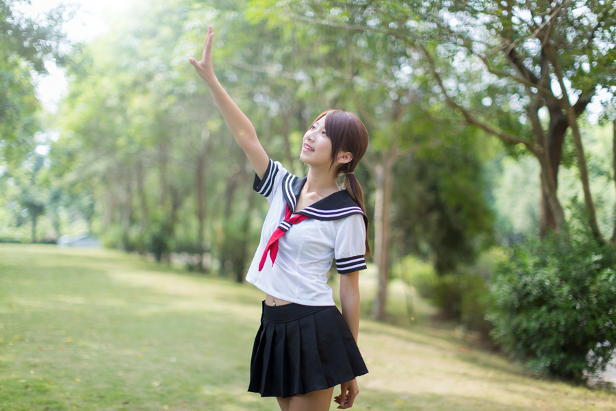 [フリー写真] セーラー服姿で手をかざす少女でアハ体験